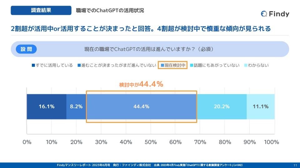 2割弱の企業は職場で既に活用していると回答し、4割超が「検討中」と回答し、職場での活用において慎重な傾向が見られています。
