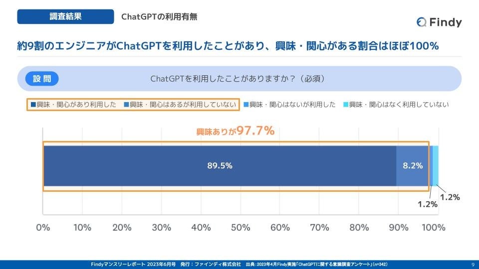 約9割のエンジニアがChatGPTを利用したことがあり、興味関心がある割合は97.7%という結果になりました。