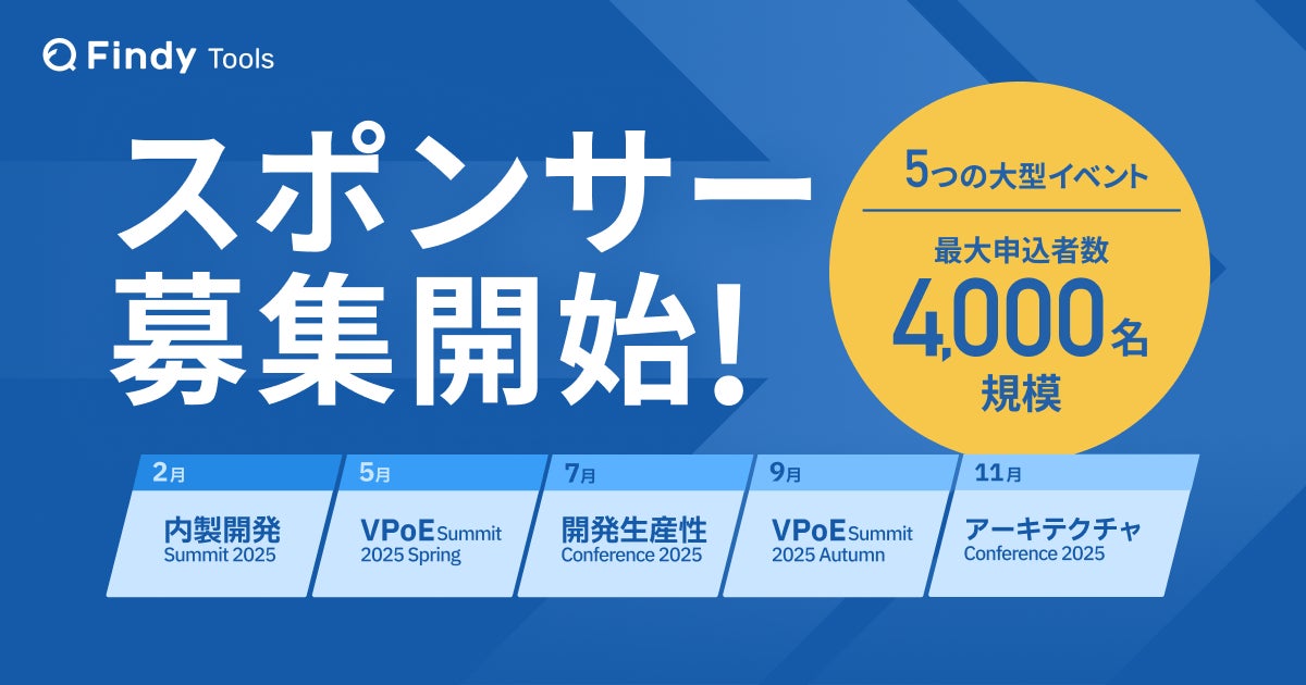 エンジニアプラットフォームを提供するファインディ株式会社(東京都品川区、代表取締役:山田 裕一朗、以下「当社」)は、本日開発者向けマーケティング支援施策として、2025年に開催する「開発者向け大規模オフラインカンファレンス」のスケジュールを公開し、各イベントのスポンサー募集を開始することを発表します。当社が主催するイベントは、開催テーマも多岐に渡り、スタートアップから大企業まで幅広い規模・分野のエンジニアが参加し、スポンサー企業とセッションやブースを通じてコミュニケーションを図ることができます。